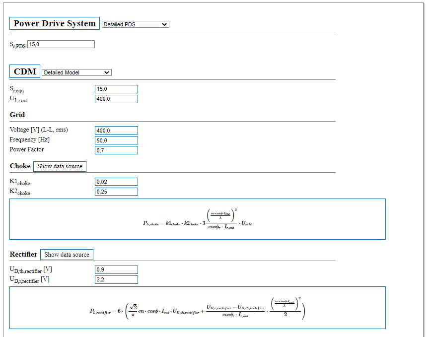 The three options for determining the losses are also available for the CDM and the motor. In the "Detailed CDM" variant, the losses can be determined at the component level of the inverter. In the current version, the calculation rules of the standard are used for this purpose.