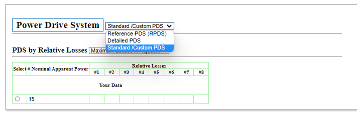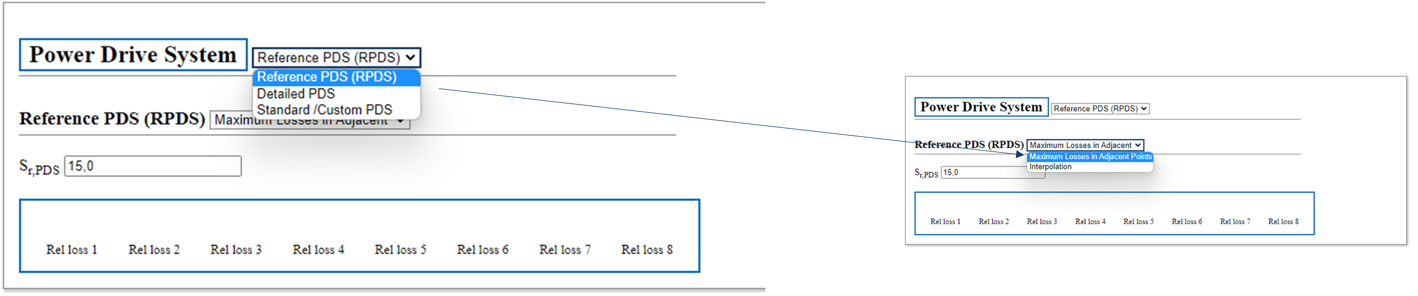 The third option is to manually enter the relative losses at the eight operating points of a real system for the PDS. Manual entries of the losses by the user are highlighted in green. The following figure shows the three variants for determining the losses of the PDS.